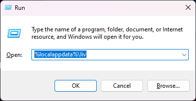 Use Windows + r key --> copy and paste this %localappdata%\LIV into the Run window that just opened
